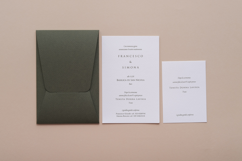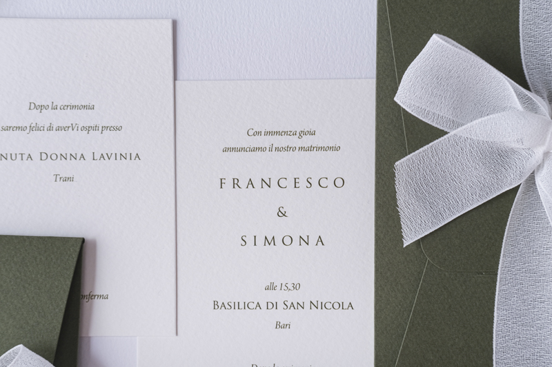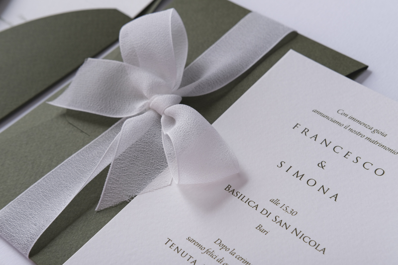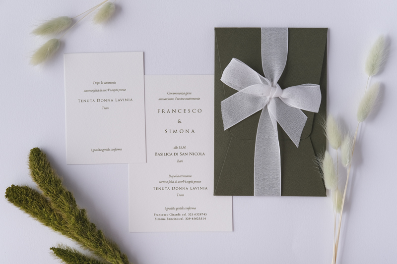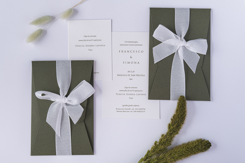 Partecipazione di matrimonio molto semplice e pulita, personalizzabile con busta in cartoncino ad incastro colori a scelta (nella foto il colore di stampa è verde ulivo – i costi sotto indicati si intendono nastri e decorazioni escluse)
