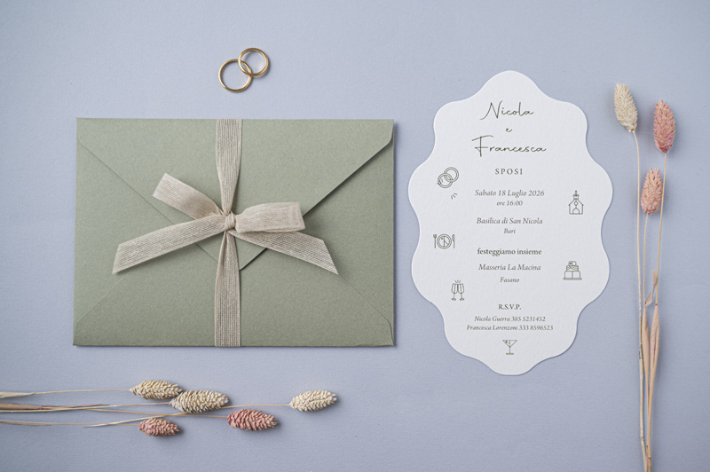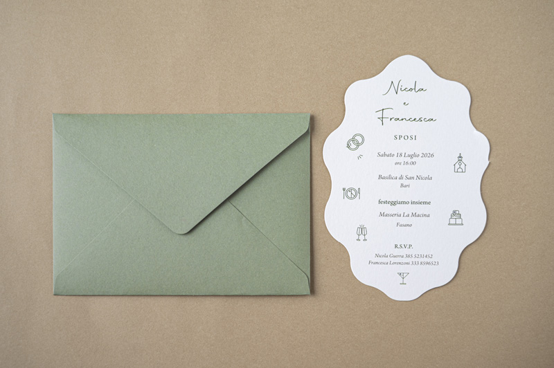 Partecipazione di matrimonio sagomata con busta grande in cartoncino dimensione 15×21 cm  (il colore di stampa in foto è verde ulivo – i costi sotto indicati si intendono nastri e decorazioni escluse)