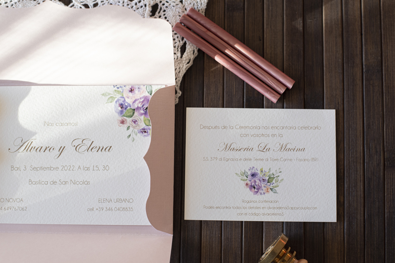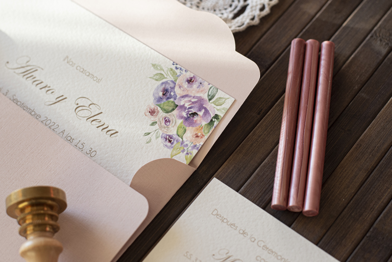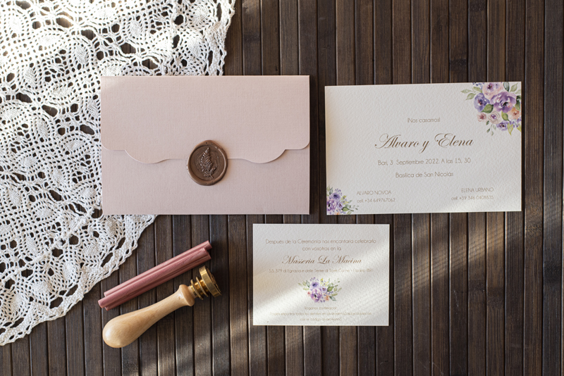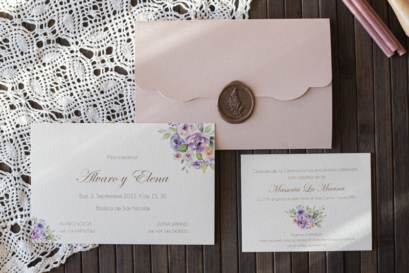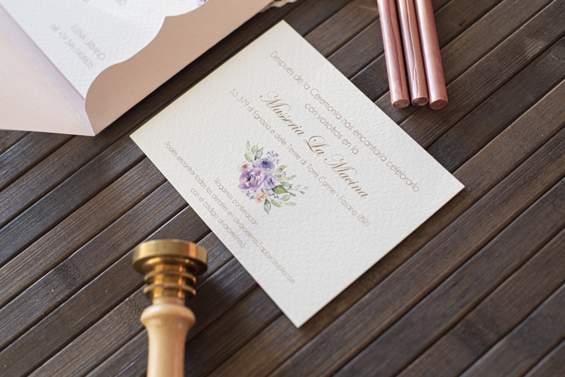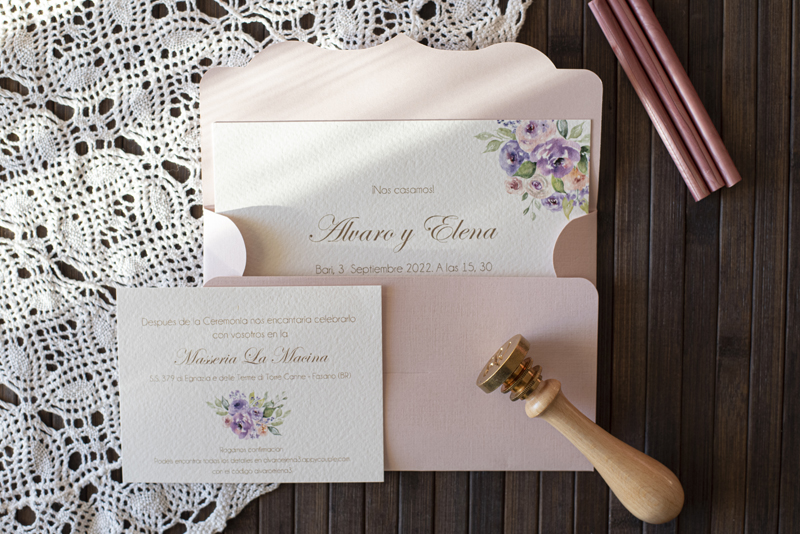 Partecipazione di matrimonio con fiori glicine con busta particolare in cartoncino  (nella foto il colore di stampa è oro opaco – i costi sotto indicati si intendono nastri e decorazioni escluse)