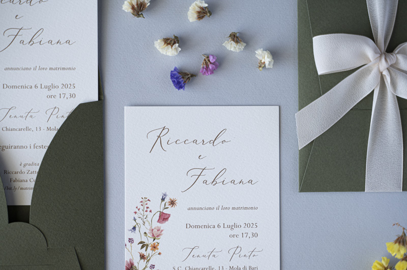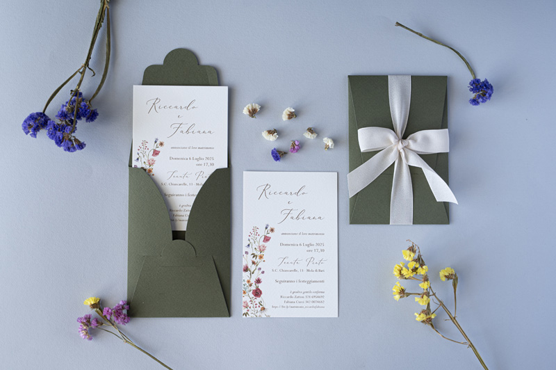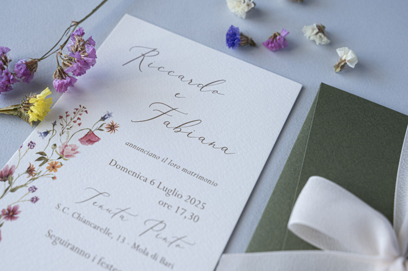 Partecipazione di matrimonio con fiori colorati e busta in cartoncino ad incastro colori a scelta (il colore di stampa in foto è oro opaco – i costi sotto indicati si intendono nastri e decorazioni escluse)