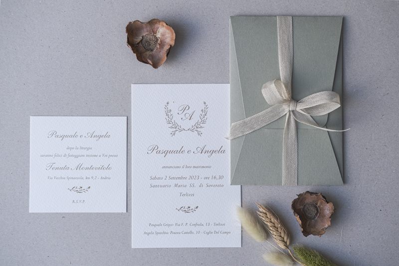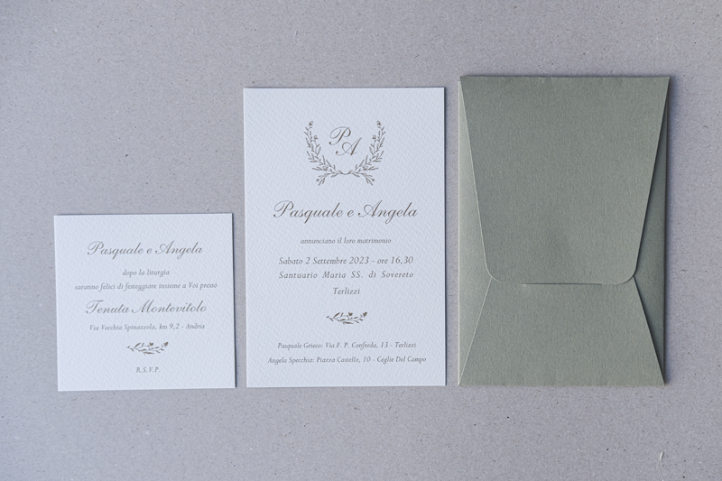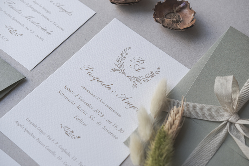 Partecipazione di matrimonio con logo di foglie di ulivo con busta in cartoncino ad incastro colori a scelta (il colore di stampa in foto è oro opaco – i costi sotto indicati si intendono nastri e decorazioni escluse)