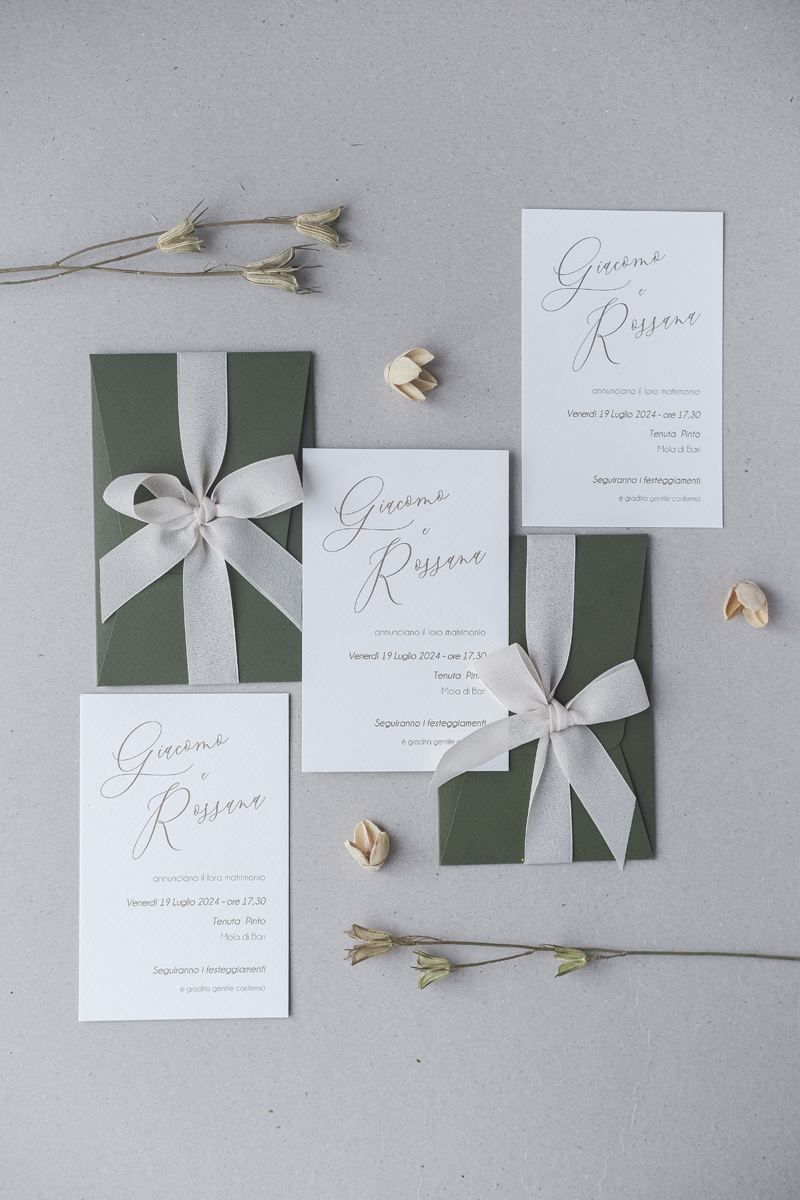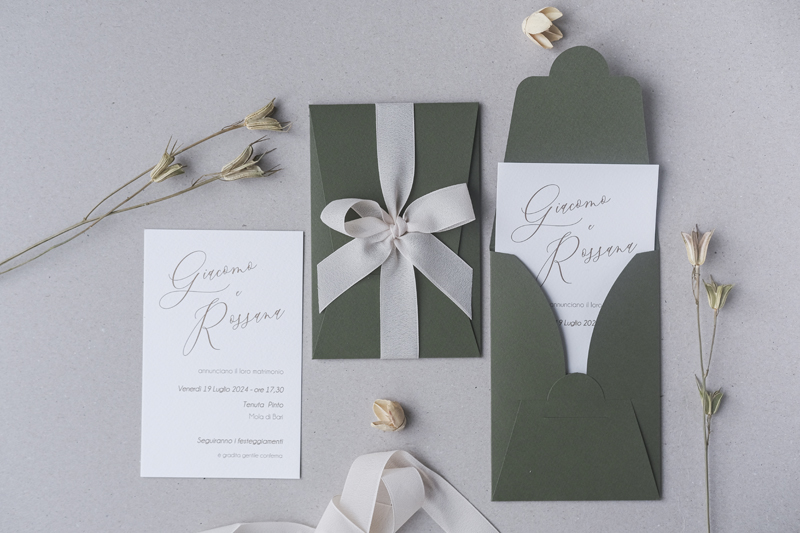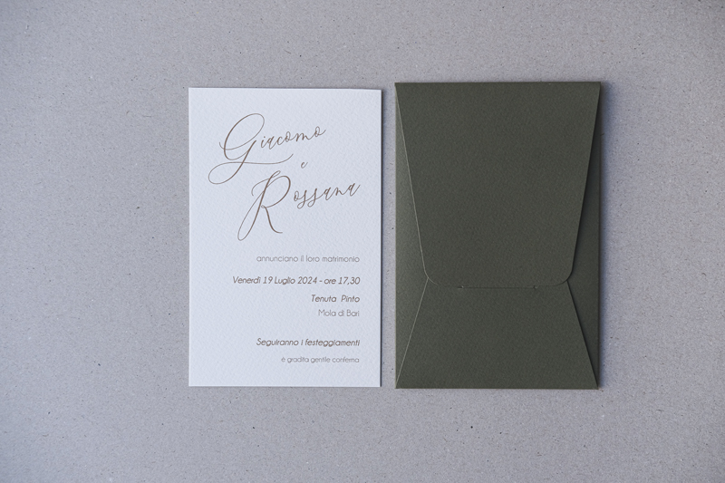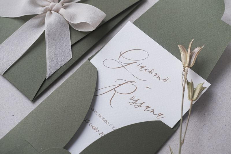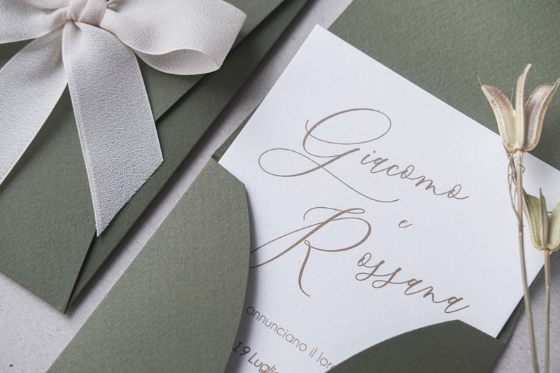 Partecipazione di matrimonio moderna e minimal con busta in cartoncino ad incastro colori a scelta (il colore di stampa in foto è oro opaco – i costi sotto indicati si intendono nastri e decorazioni escluse)