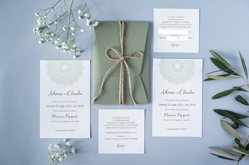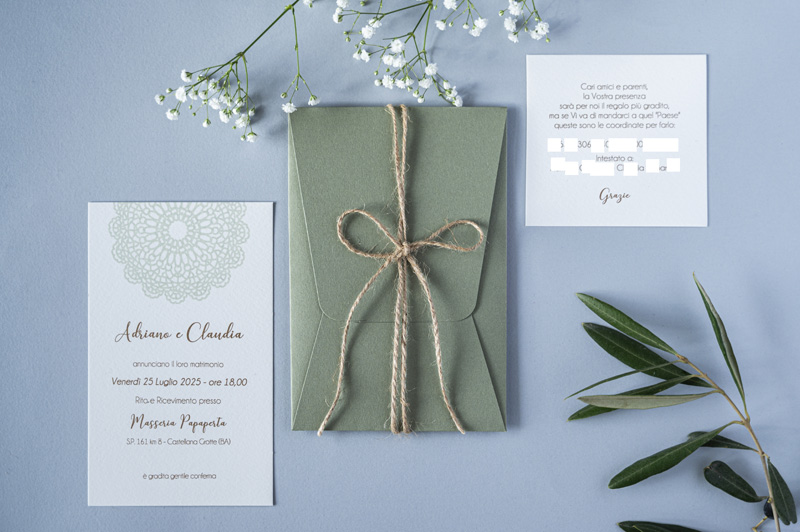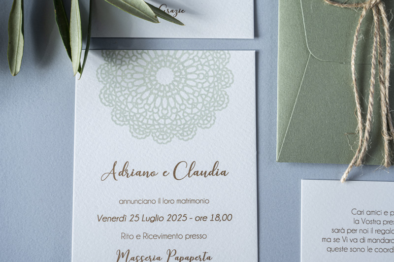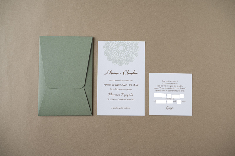 Partecipazione di matrimonio con un rosone tipico pugliese e  busta in cartoncino ad incastro colori a scelta (il colore di stampa in foto è oro opaco – i costi sotto indicati si intendono nastri e decorazioni escluse)